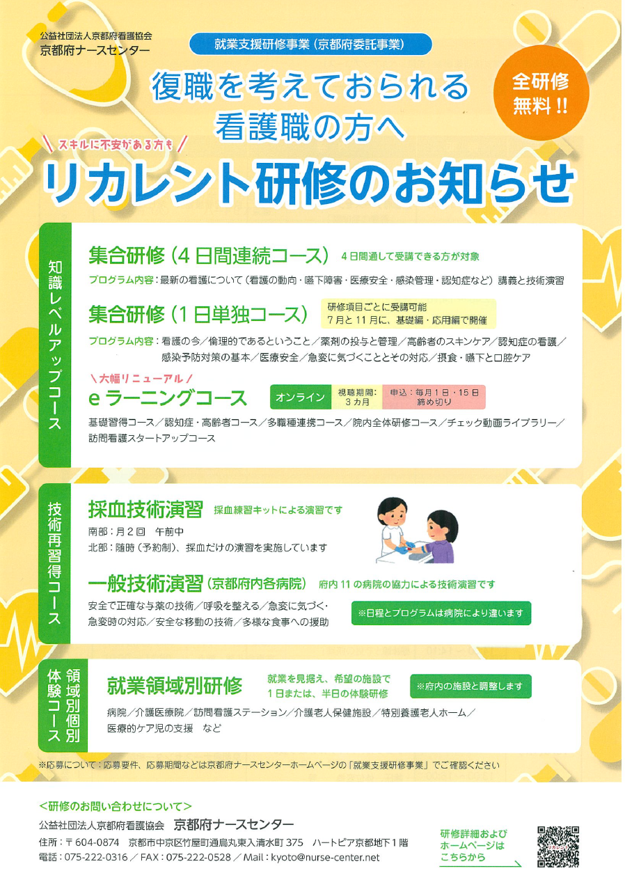 | 備考 | ※開催日の1週間前までにお申し込みください。 ※申し込み方法など詳細は、京都府ナースセンターにお問い合わせください。 |